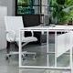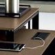 Velvet par Frezza: inspirations géométriques. Structure et plateaux dialoguent en une harmonieuse combinaison chromatique qui joue au miroir avec les meubles de rangement. Verre, cuir et mètal, matériaux polysensoriels pour un confort total à votre poste de travail.