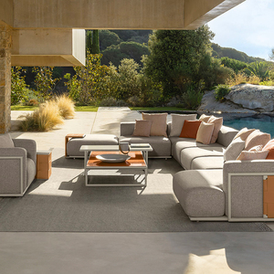 Chaque module est en teck naturel ou vieilli. Le système comprend des modules sans dossier, d’angle ou profonds à combiner librement. Les coussins d’extérieur généreusement rembourrés sont habillés de tissus techniques déhoussables et résistants.